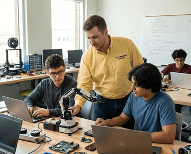 Nossos instrutores são especialistas em tecnologia, capacitados para ensinar programação e robótica de forma dinâmica e descontraída, garantindo um aprendizado eficaz e divertido para crianças e adolescentes.